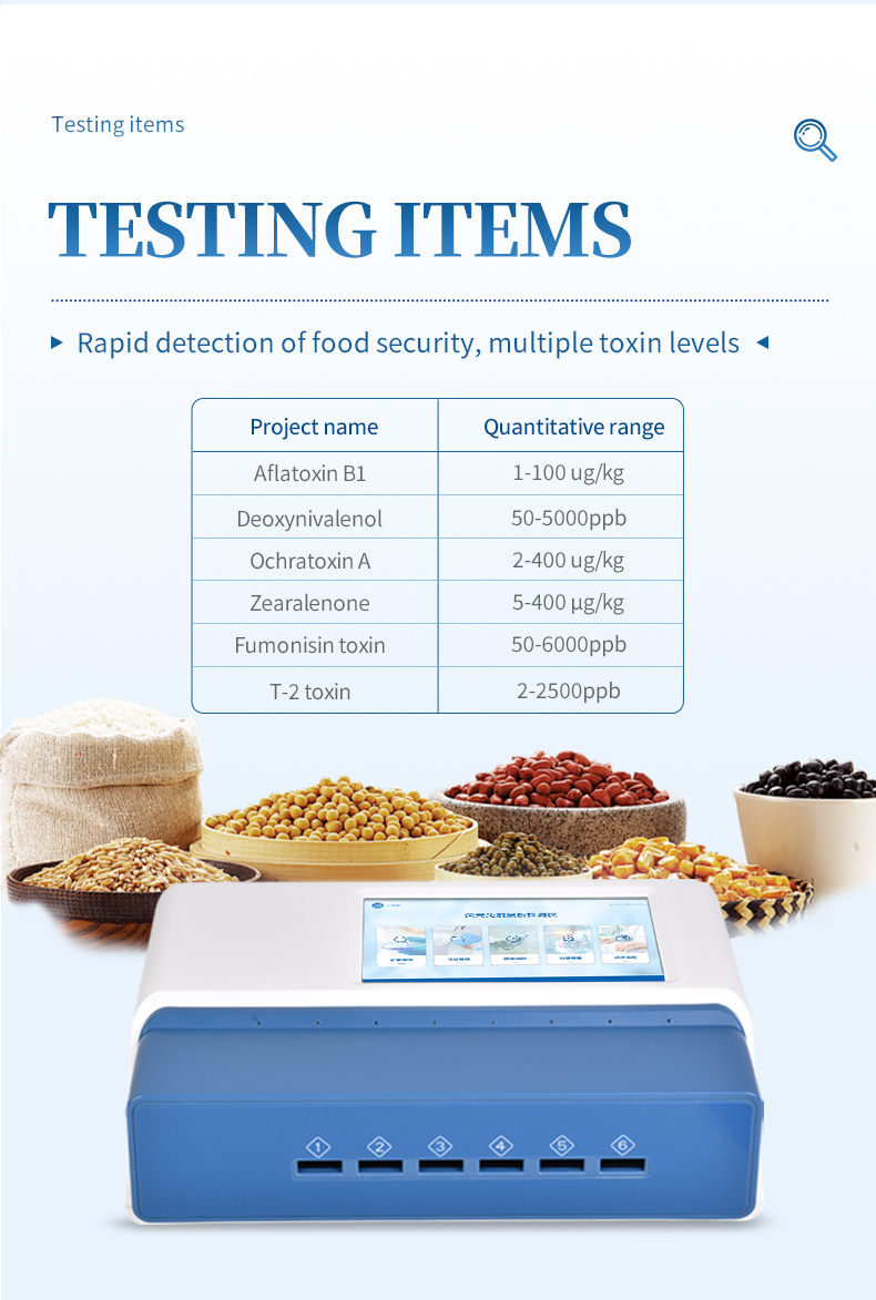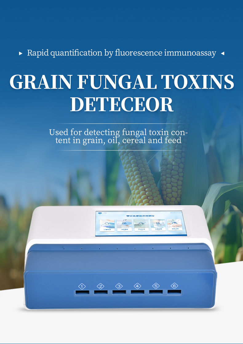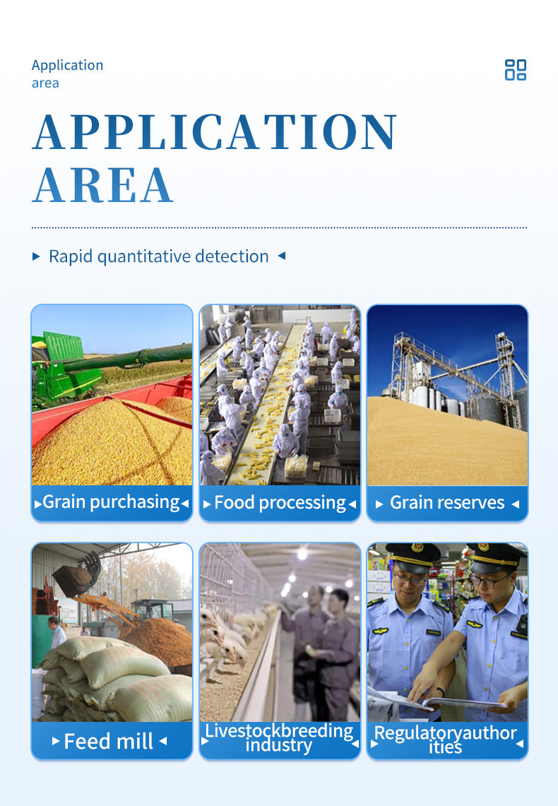 The mycotoxin detector adopts the principle of fluorescence quantitative rapid detection, mainly detecting the content of fungal toxins in grain, oil, grain and feed, including aflatoxin B1, aflatoxin M1, zearalenone, vomitoxin, fumonisin, etc. The detection samples cover grains (rice, corn, wheat, barley, sorghum, etc.) and their products, feed and its raw materials, edible oils and fats, milk and its products, etc; The sample pre-treatment is simple, and the entire testing process takes 12 minutes. The product is suitable for local grain depots, grain production enterprises, feed mills, various animal husbandry enterprises, flour mills, food processing plants, third-party testing institutions, and government regulatory departments at all levels;