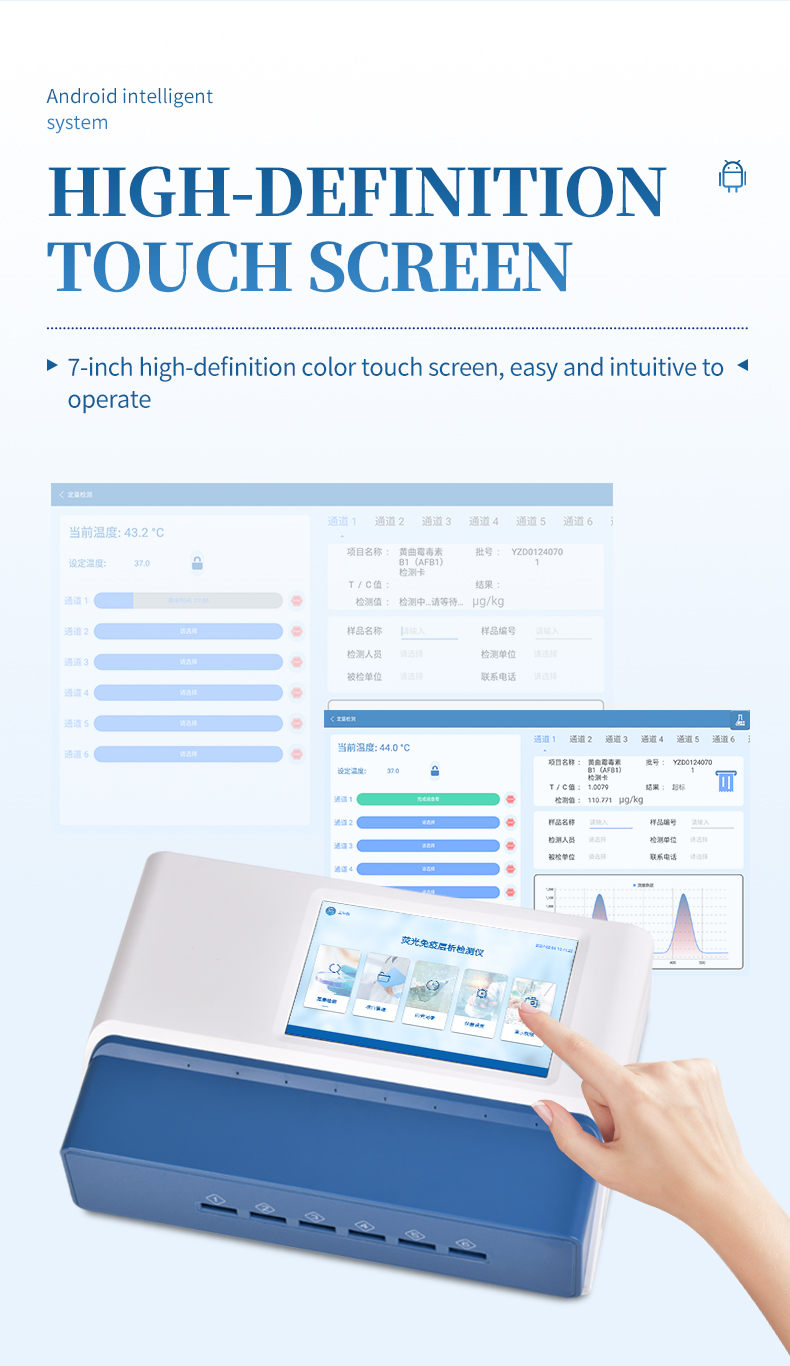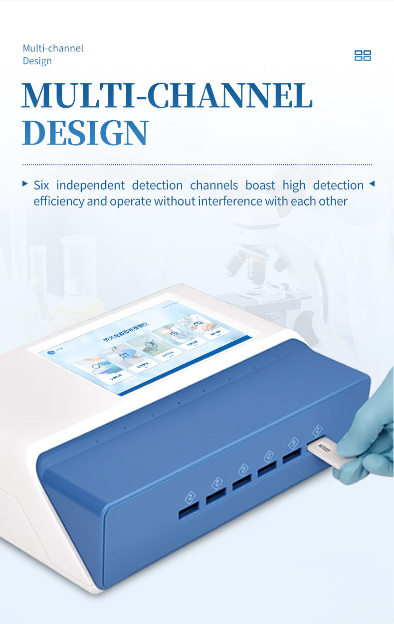 2. Extremely high stability: using imported fluorescent microspheres with uniform particles, ensuring good product stability from the source and good reproducibility within and between batches; Equipped with 8-well constant temperature incubator, one by one, automatic timing, buzzer reminder, not affected by external temperature and humidity, suitable for a wider range of venues;