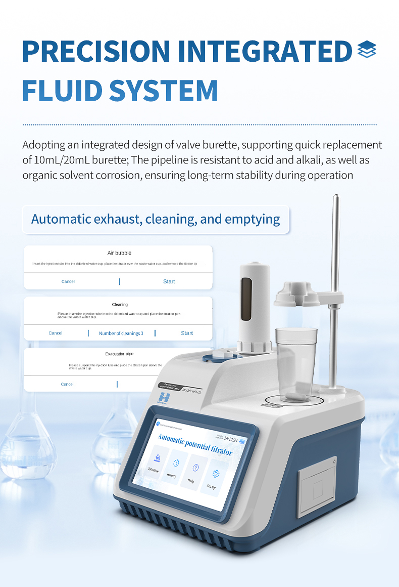 Integrated valve-burette design, easy to replace, effectively avoiding cross-interference between different titration solutions. The burette is made of high-strength materials resistant to acids, alkalis, and organic solvents. It supports 10mL and 20mL burette specifications with high-precision titration performance (repeatability ≤0.2%).