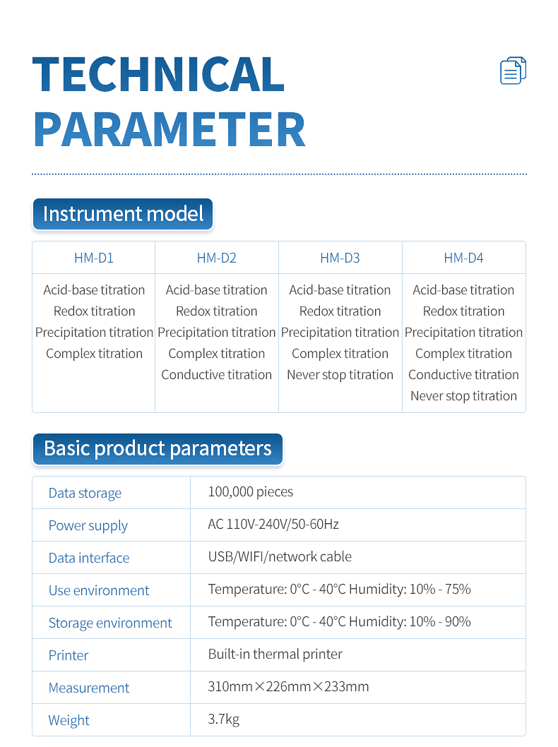 The HM-D4 series is an advanced version of the automatic potentiometric titrator, integrating more measurement modules for comprehensive analysis. In addition to the titration, control, and measurement devices, it is equipped with Conductivity and Dead-stop modules. It supports a full range of titration types: acid-base, redox, precipitation, complexometric, conductometric, and dead-stop titrations. This model is ideal for complex laboratory environments requiring versatile measurement modes and high-precision automation.