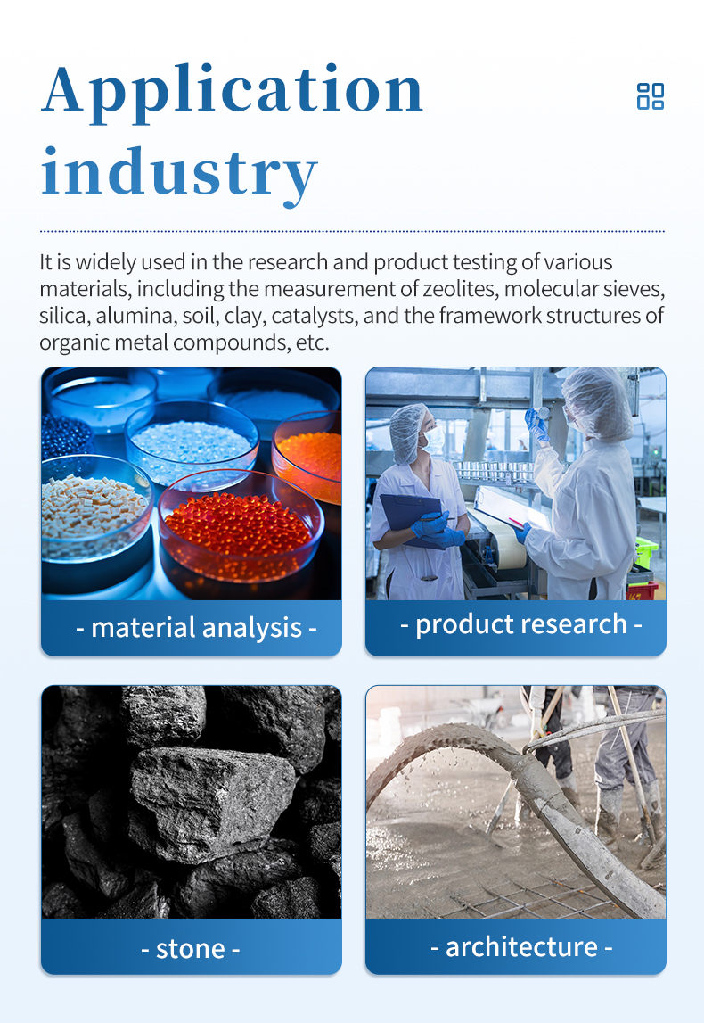 Research and product testing of various materials, including measuring zeolites, molecular sieves, silica, alumina, soil, clay, catalysts, organic metal compound skeleton structures, and other materials.