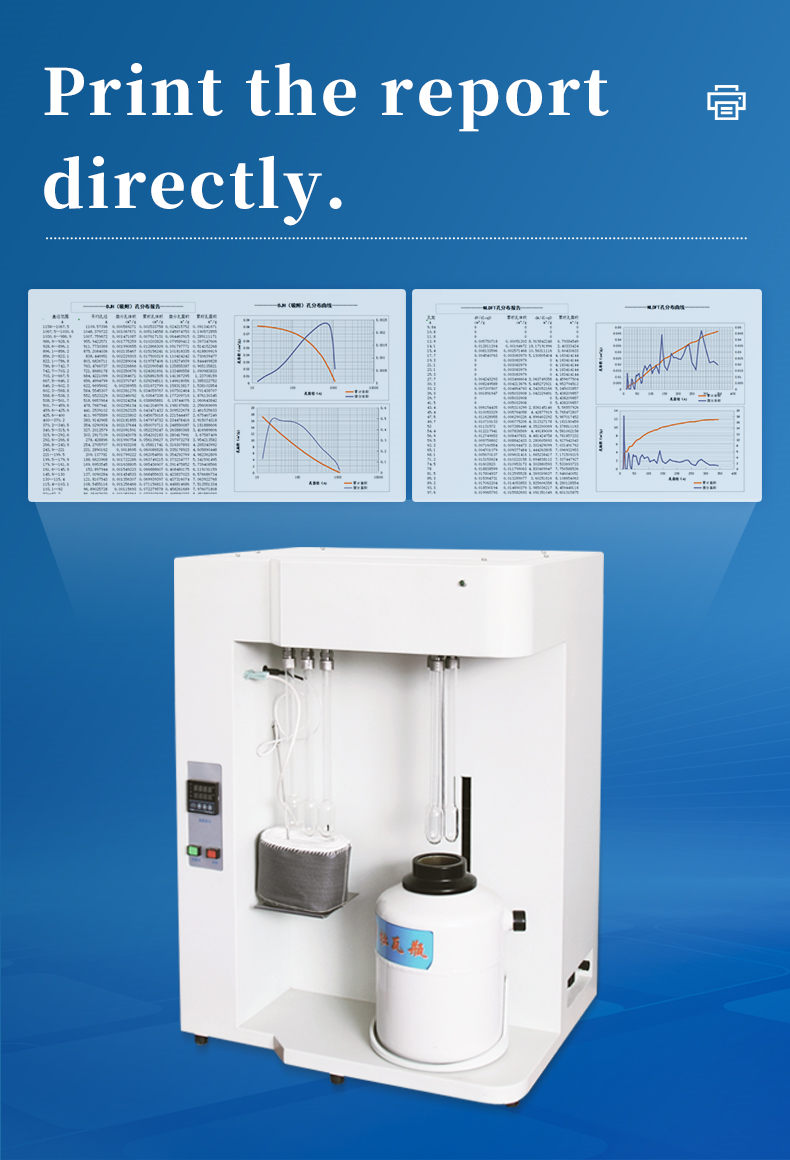 Directly print and EXCEL output adsorption desorption isotherms, BET specific surface area Langmuir specific surface area, t-plot micropore volume, BJH pore volume, pore area, total pore volume, total pore area, Dbinin Astakhov, Horvath Kawazoe, SF, MP micropore distribution, NLDFT/GCMC pore distribution, and review report.