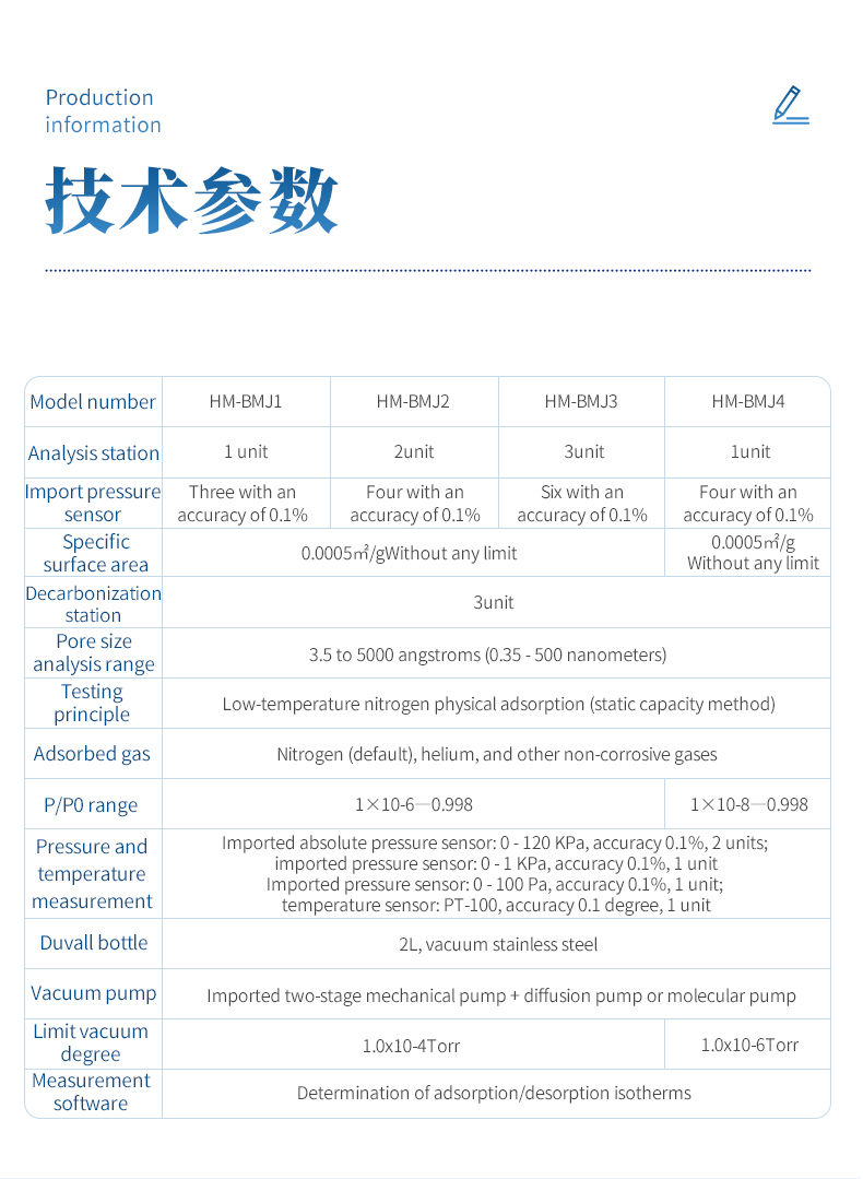 The fully automatic specific surface area and porosity analyzer complies with international standards such as ISO9277, ISO15901, and national standards such as GB/T19587. The adsorption process is tested using the static capacity method through mass balance equations, static gas equilibrium, and pressure measurements. The testing process is conducted at liquid nitrogen temperature. When a known amount of gas is injected into the sample tube through a branch, it will cause a pressure drop. Therefore, the molar mass of the adsorbed gas at adsorption equilibrium can be calculated. By measuring the equilibrium adsorption capacity, the theoretical model is used to determine the single point and multi-point BET specific surface area and Langmuir specific surface area of the tested sample; Volume and area distribution of BJH mesopores and macropores, total pore volume; T-plot micropore volume and surface area, Dubinin Astakhov micropore distribution, Horvath Kawazoe, SF micropore distribution, MP micropore distribution; Non local density function theory (NLDFT) and Monte Carlo (GCMC) aperture distribution model parameters.