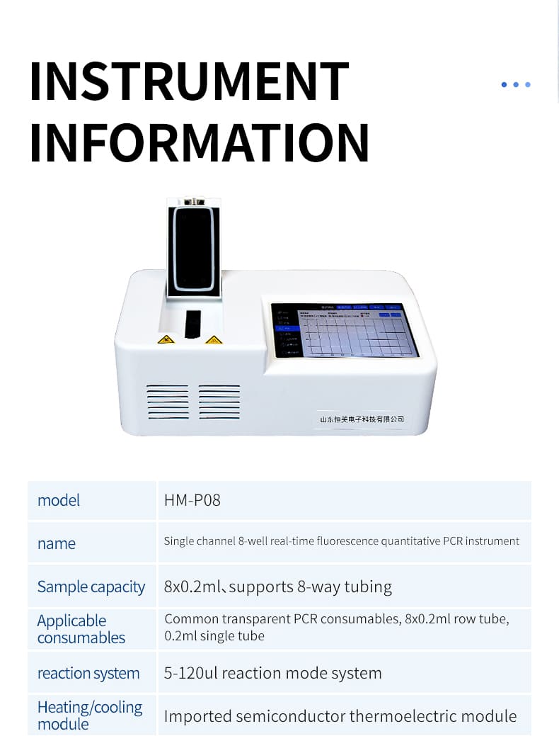 The principle of HM-P16 real-time fluorescence quantitative PCR instrument: Polymerase chain reaction (PCR) is a molecular biology technology used to amplify specific DNA fragments. It can be seen as a special DNA amplification in vitro, consisting of several steps such as high-temperature denaturation, low-temperature annealing, and appropriate temperature extension to form a temperature cycle, allowing the target gene to be rapidly amplified. It has strong specificity, high sensitivity, simple operation, and time-saving characteristics, and is a major innovation in gene amplification technology. PCR technology can specifically amplify extremely small amounts of target DNA by millions of times, greatly improving the analysis and detection capabilities of DNA molecules.