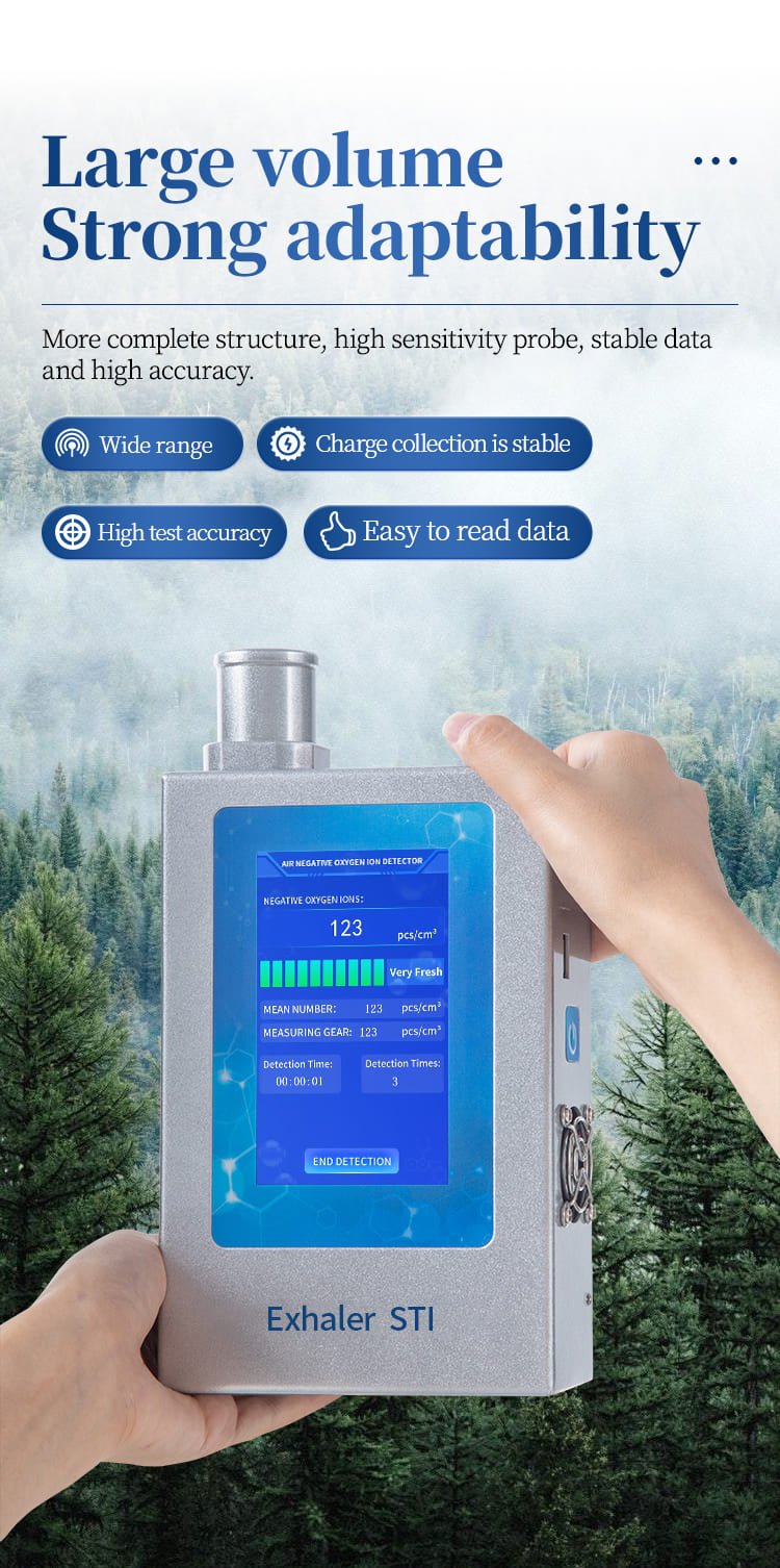 Real time measurement of atmospheric negative ion concentration in the air is a preferred tool for environmental monitoring, nano coatings, negative ion health products, negative ion home decoration materials, indoor testing, air governance, air purifiers and their products to measure and demonstrate negative ion concentration.