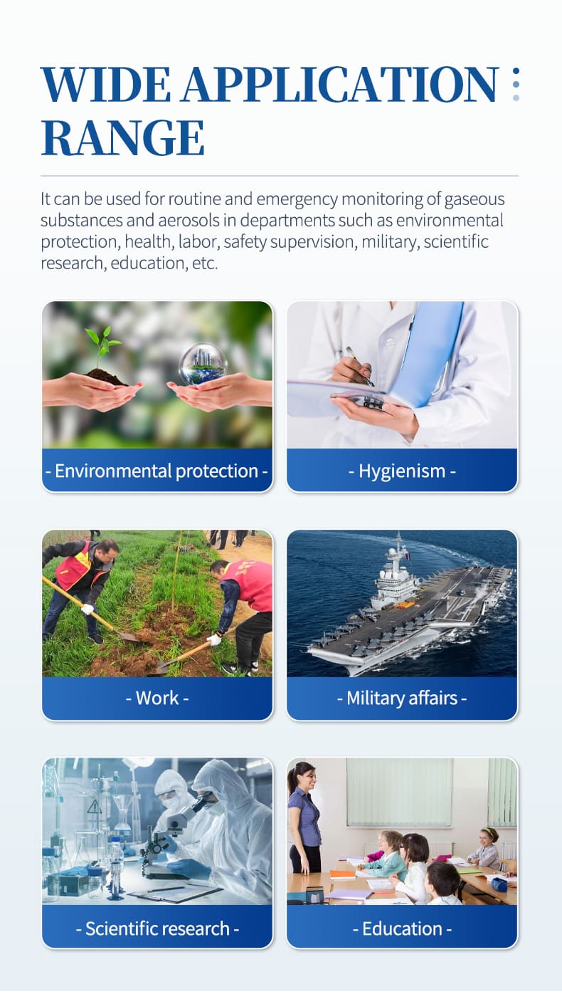 Portable environmental air comprehensive sampler applies solution absorption method to collect various harmful gases in the ambient air and indoor air; The filter membrane weighing method is used to capture total suspended particles (TSP) and inhalable particles (PM10) or (PM2.5), fluoride, heavy metals, SVOC, etc. in the ambient atmosphere. It can be used for routine and emergency monitoring of gaseous substances and aerosols by departments such as environmental protection, health, labor, safety supervision, military, scientific research, education, etc.