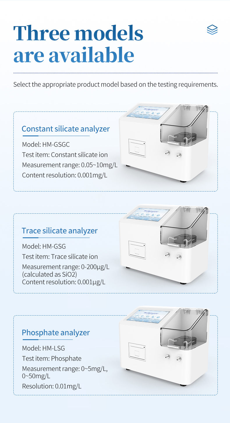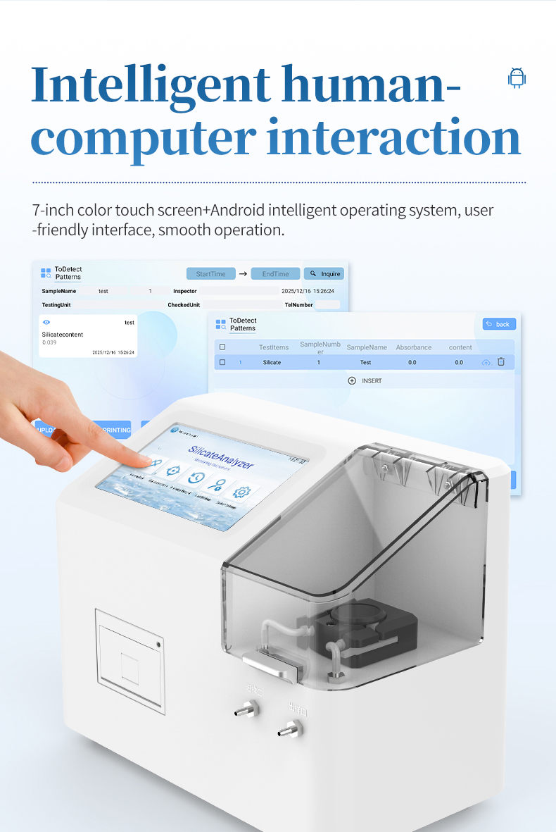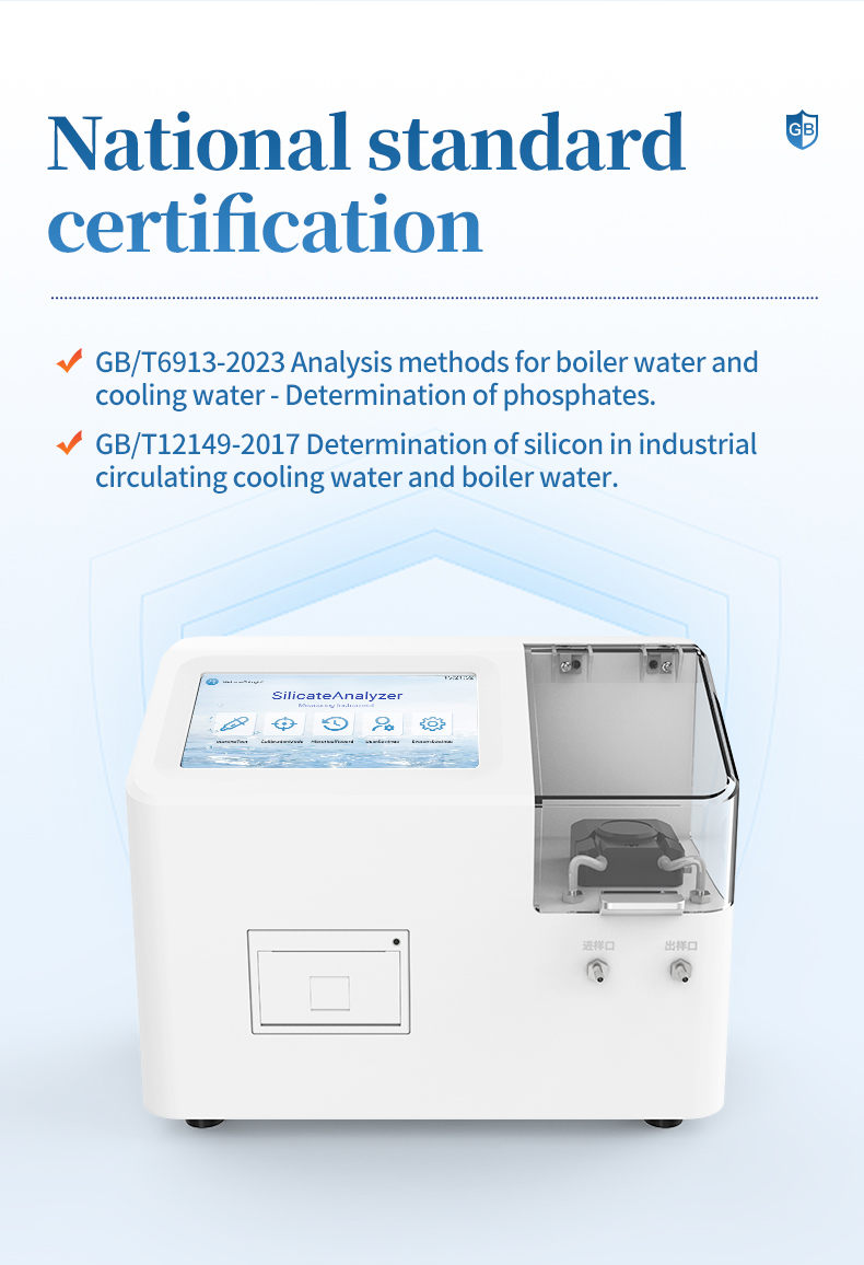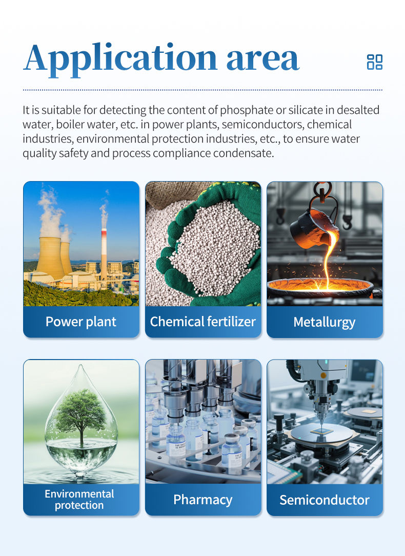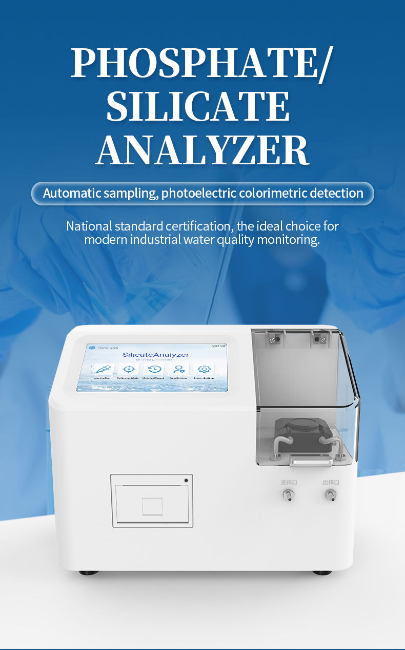 The laboratory phosphate analyzer is a rapid analysis equipment that integrates automatic sampling technology and photoelectric detection technology. The instrument performs colorimetric quantification on the reaction solution after color development, and obtains the corresponding phosphate content based on the built-in standard curve of the instrument. This instrument is suitable for industries such as power plants, chemical fertilizers, metallurgy, environmental protection, pharmaceuticals, chemical fibers, semiconductors, etc. It is suitable for detecting and analyzing the content of soluble phosphate ions in water such as desalinated water, steam condensate water, and boiler water. Designed and manufactured in accordance with the standard GB/T 6913-2023 Analysis Methods for Boiler Water and Cooling Water - Determination of Phosphates.