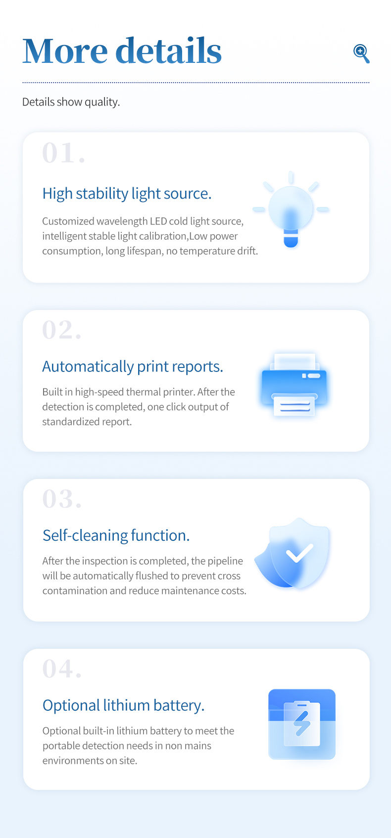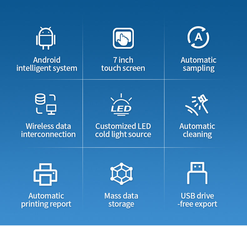 4. Customized wavelength high stability LED cold light source, with more stable detection data, low power consumption, and long lifespan;