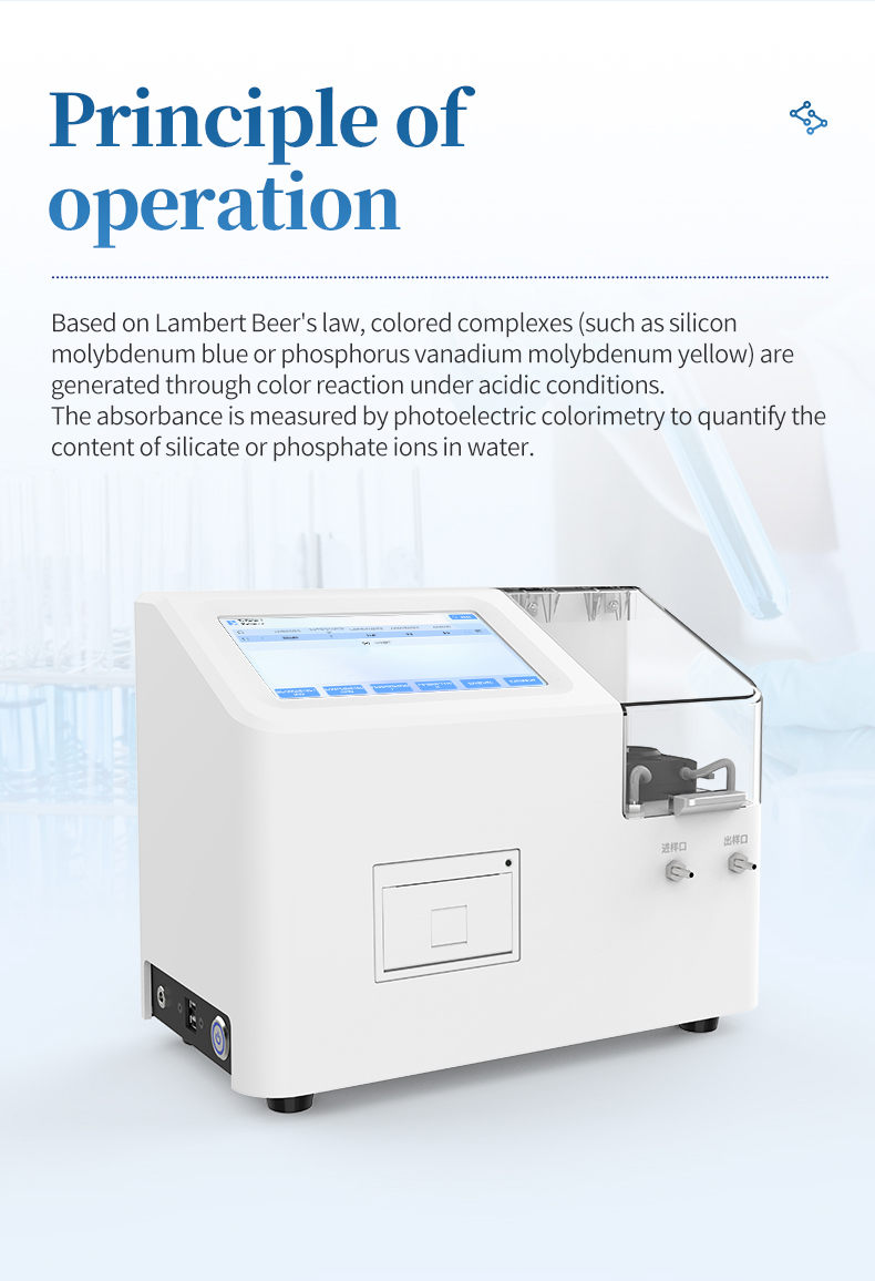 The laboratory phosphate analyzer uses the principle of photoelectric colorimetry for measurement. Phosphate in acidic water samples reacts with vanadium molybdate to form a yellow mixture of phosphorus, vanadium, and molybdic acid. The phosphate ion content is then determined using a phosphate analyzer based on the principle of photoelectric colorimetry. According to Lambert Beer's law, when a monochromatic parallel light passes through a colored solution, a portion of the light energy is absorbed by the solution. If the thickness of the liquid layer remains constant, the degree of light energy absorption (absorbance A) is proportional to the concentration of colored substances in the solution.
