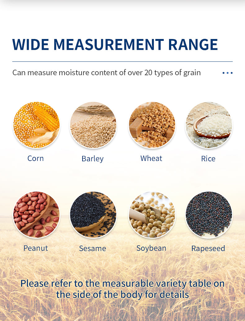 Measurement range: Can measure non-metallic granular substances such as grains, corn, Northeast corn, barley, wheat, white wheat, rice, soybean meal, peanut kernels, rapeseed meal, sorghum, black sesame, cottonseed, cottonseed meal, indica, soybean, rapeseed, feed, vegetable seeds, etc.