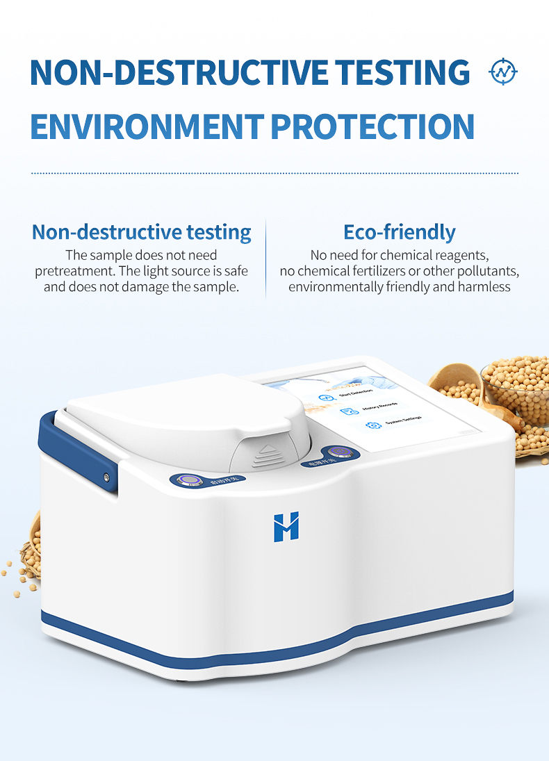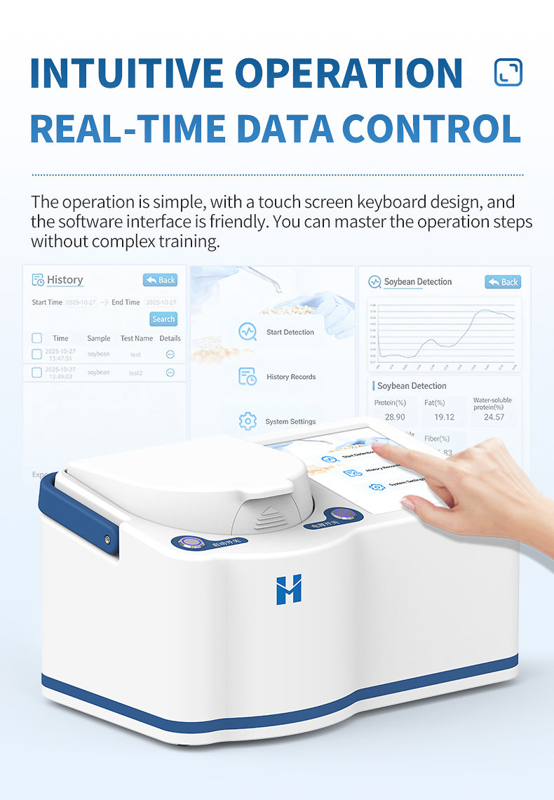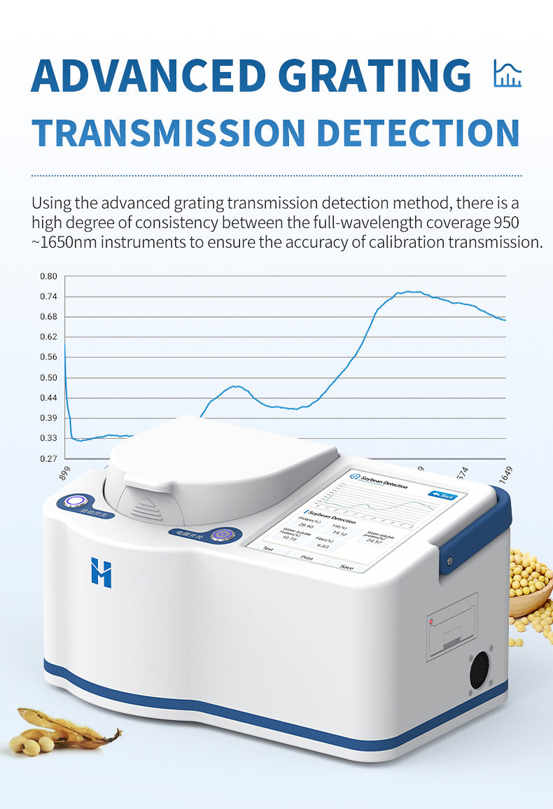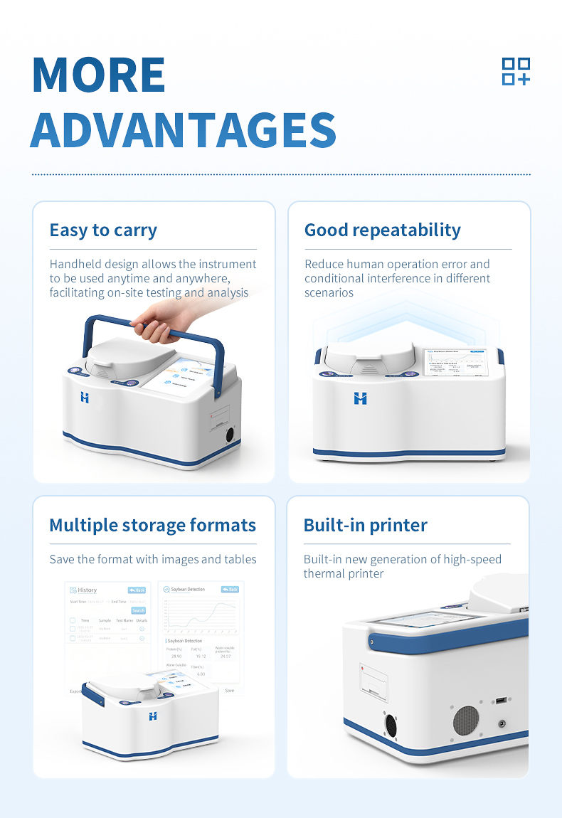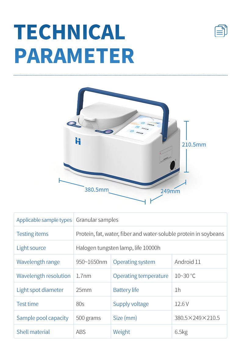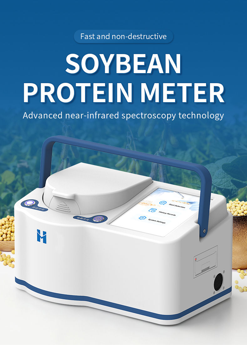 The portable near-infrared soy protein analyzer adopts advanced near-infrared spectroscopy technology, which can simultaneously and non destructively detect indicators such as protein, fat, water-soluble protein, fiber, and moisture in soybeans. The analysis process does not require complex preprocessing, and results can be obtained within seconds, greatly improving detection efficiency and reducing time and labor costs. This instrument is intelligent and easy to operate, with stable and reliable results. It is an ideal tool for raw material acceptance, process control, and quality assessment in fields such as grain and oil processing, food testing, breeding research and development, and trade procurement.