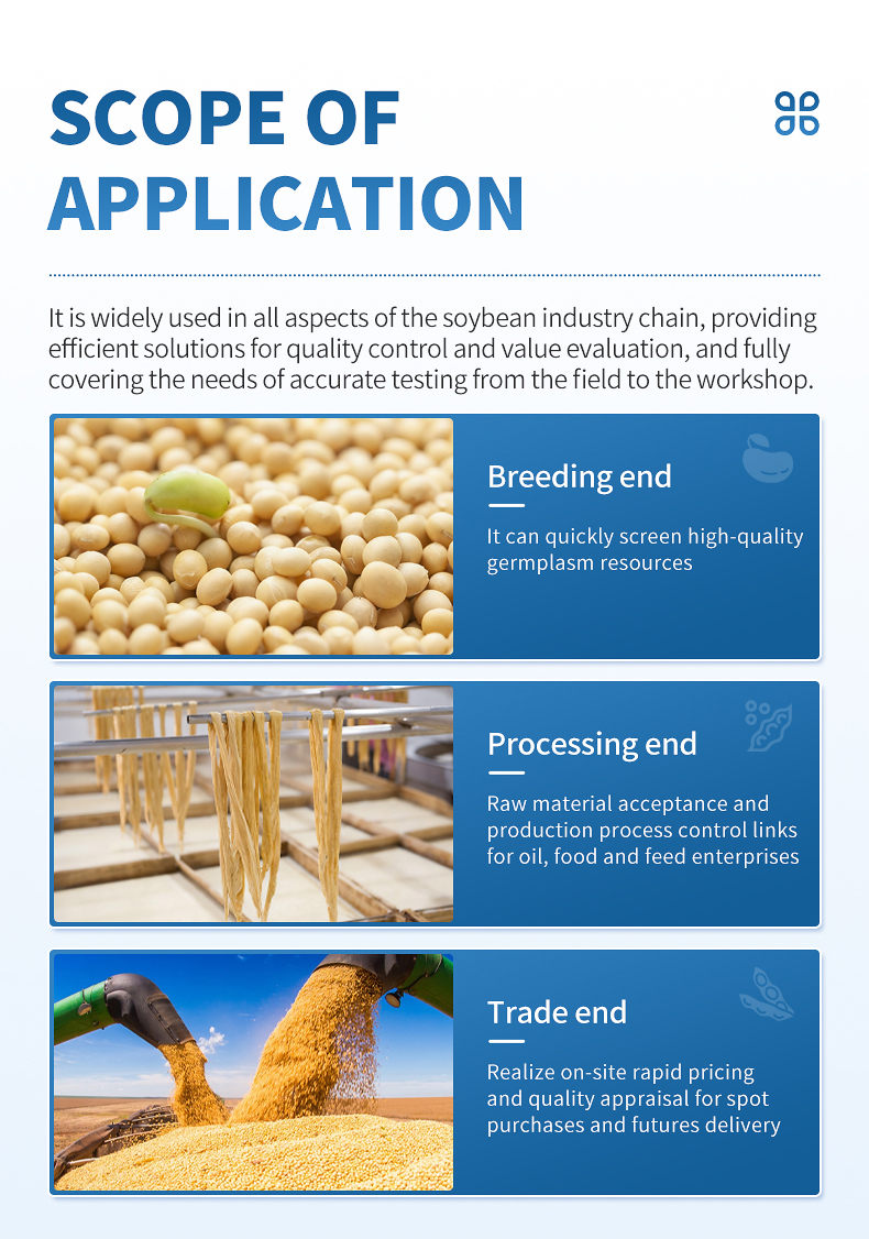 This instrument is widely used in various links of the soybean industry chain, providing efficient solutions for quality control and value evaluation. At the breeding end, high-quality germplasm resources can be quickly screened; At the processing end, serving the raw material acceptance and production process control links of oil, food, and feed enterprises; On the trading side, achieve on-site rapid pricing and quality appraisal for spot purchases and futures delivery. At the same time, it is also a powerful tool for scientific research and testing institutions to conduct component analysis and scientific research, comprehensively covering the precise testing needs from the field to the workshop.
