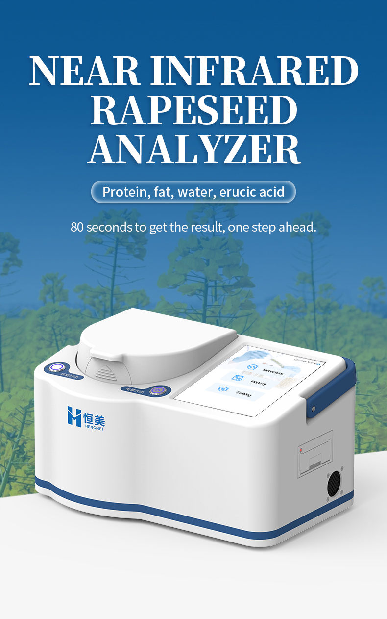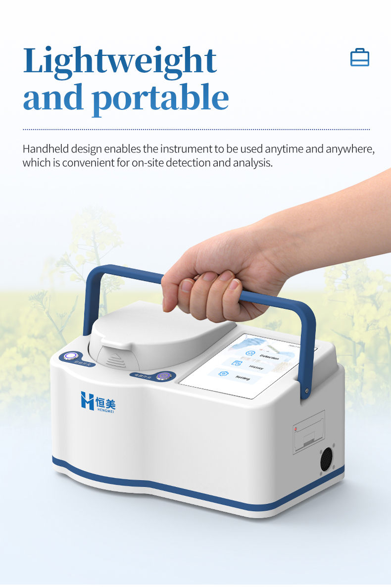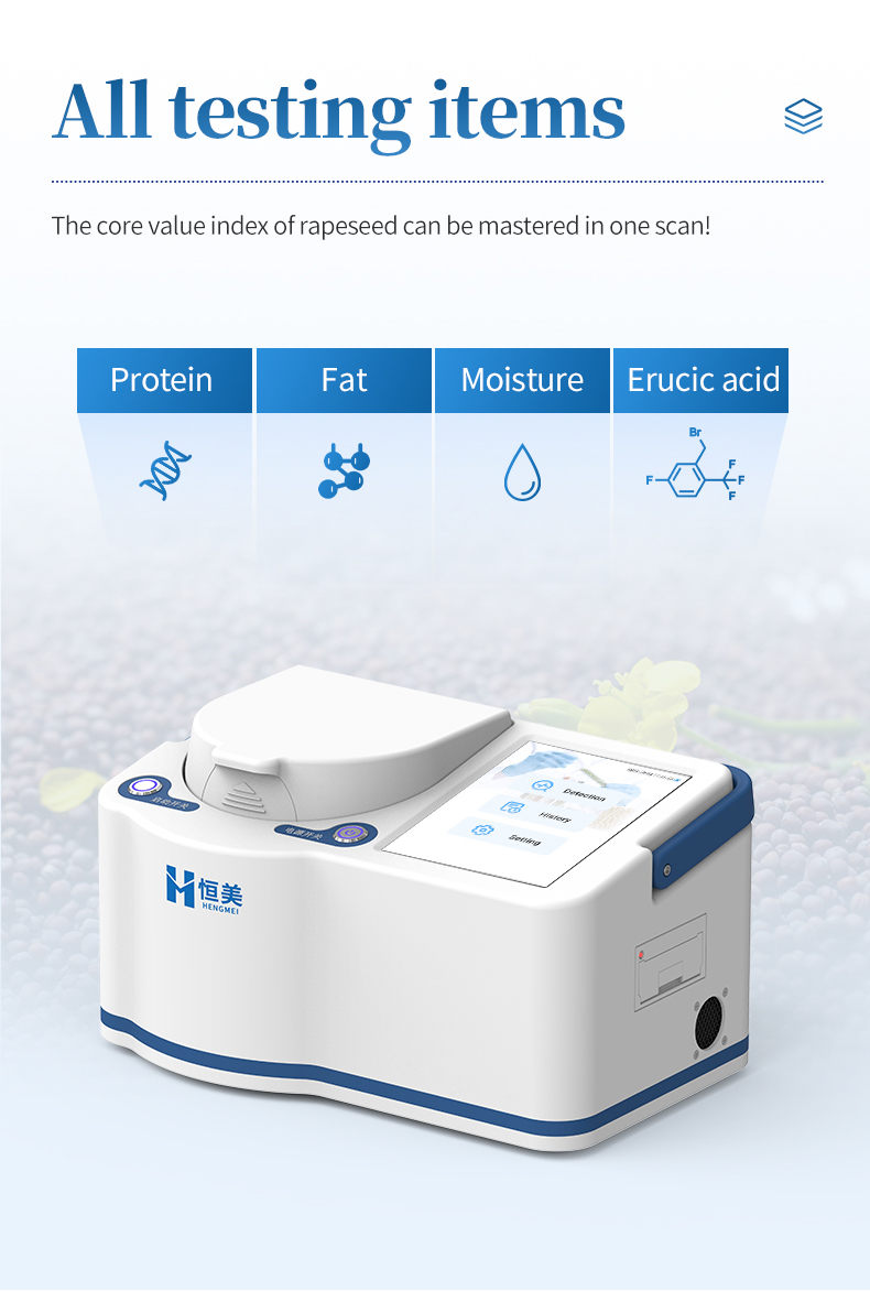 The portable near-infrared rapeseed analyzer uses near-infrared spectroscopy technology to simultaneously and non destructively detect indicators such as protein, fat, moisture, and erucic acid in rapeseed. The analysis process does not require complex preprocessing, and results can be obtained within seconds, greatly improving detection efficiency and reducing time and labor costs. This instrument is intelligent and easy to operate, making it an ideal tool for raw material acceptance, process control, and quality assessment in fields such as grain and oil processing, food testing, breeding research and development, and trade procurement.