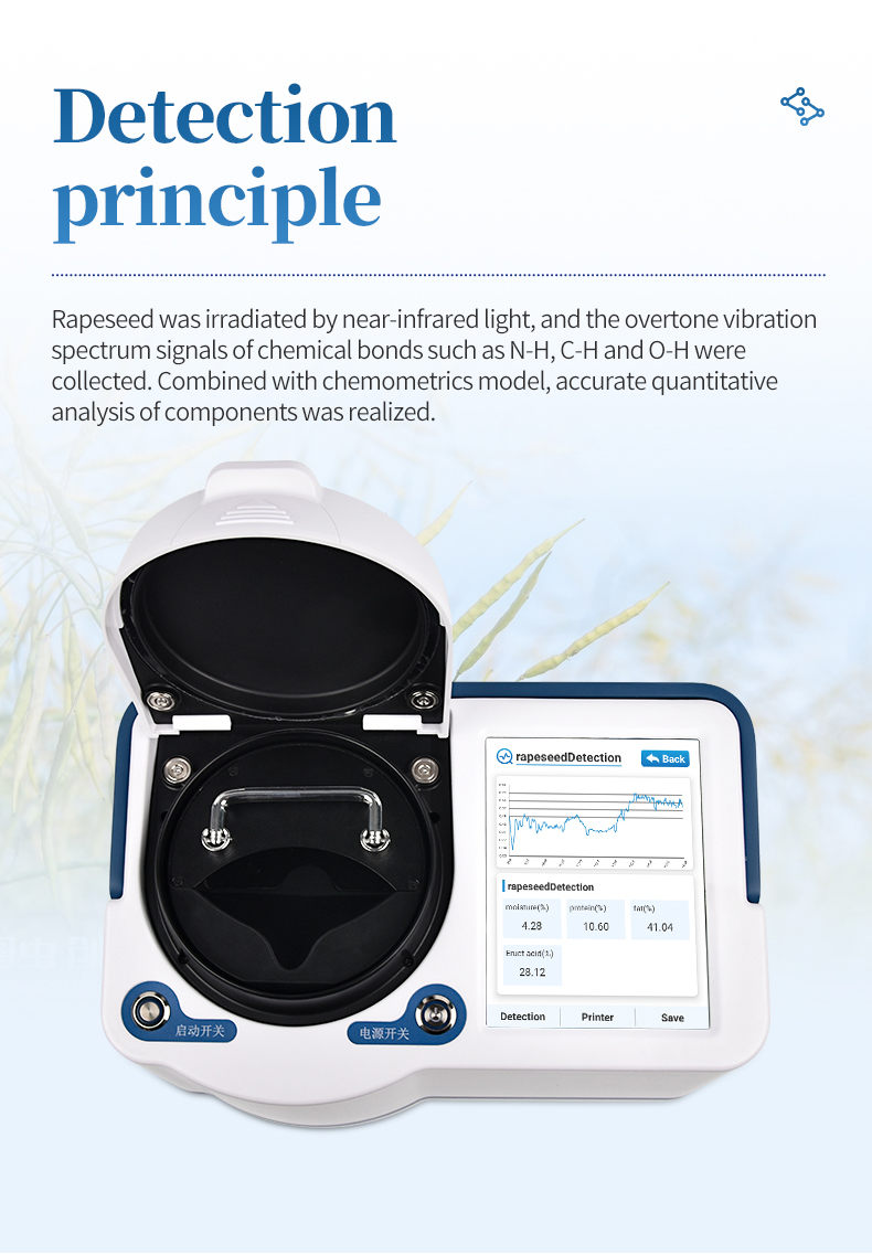 The spectral information collected based on Near Infrared (NIR) spectroscopy technology contains the pan frequency vibration or rotation information of chemical bonds such as N-H, C-H, O-H, C-O of sample substances (such as proteins, fats, water, and erucic acid molecules). By using chemometric methods to establish a mathematical correlation between spectral information and the composition of the measured substance, quantitative analysis of relevant detection indicators can be achieved.