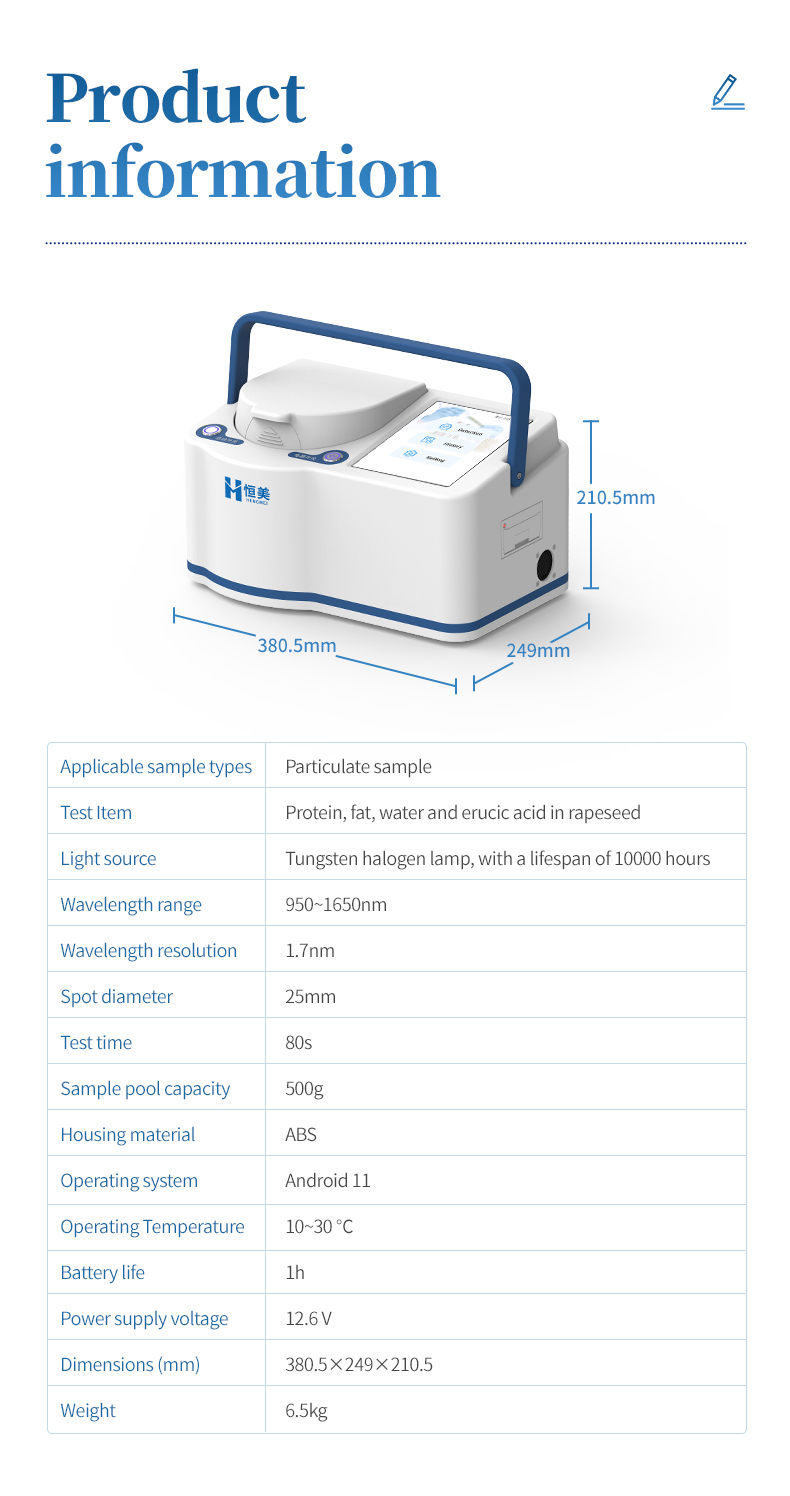 1. Fast analysis speed: rapeseed indicators can be measured within 1-1.5 minutes;