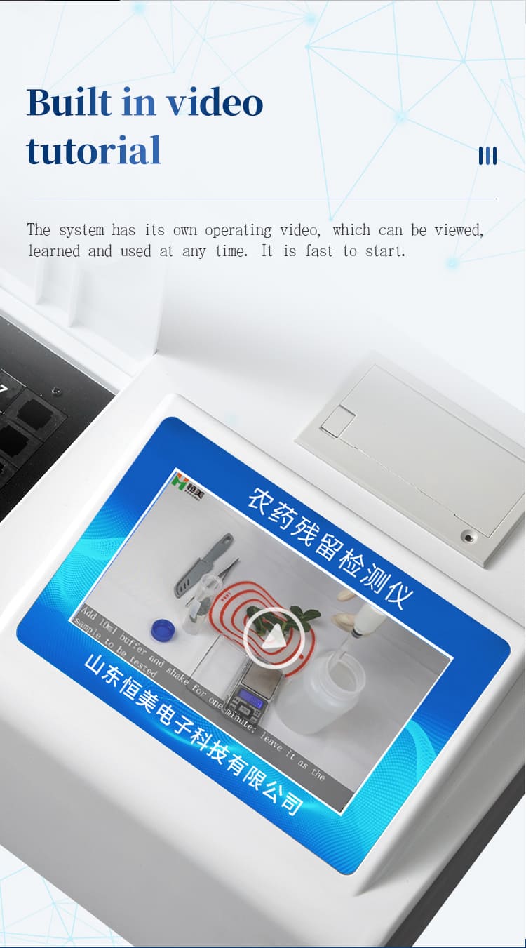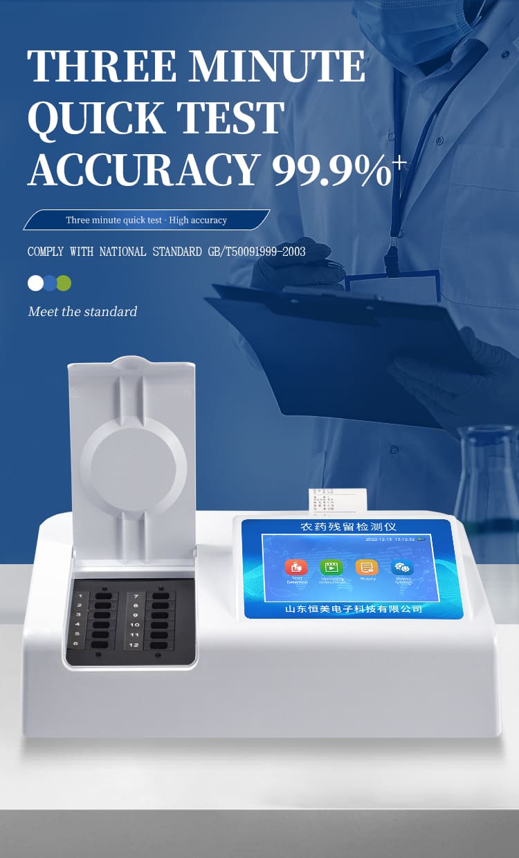 Widely used for rapid detection of organic phosphorus and carbamate pesticide residues in foods such as vegetables, fruits, tea, grains, and agricultural by-products; In addition, it can also be used for on-site testing in fruit and vegetable tea production bases and agricultural wholesale and sales markets, as well as safety rapid testing before processing fruits and vegetables in restaurants, schools, canteens, and households.