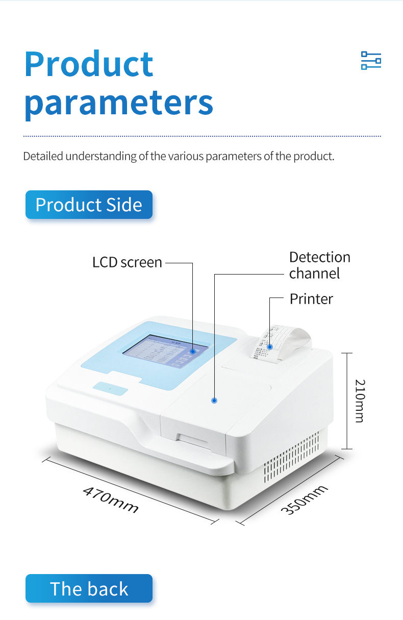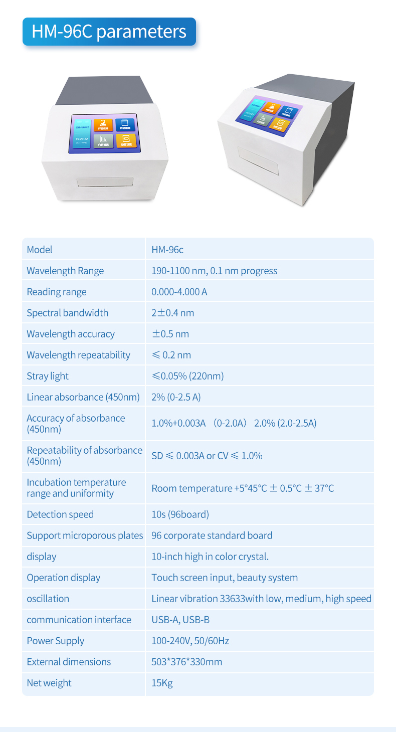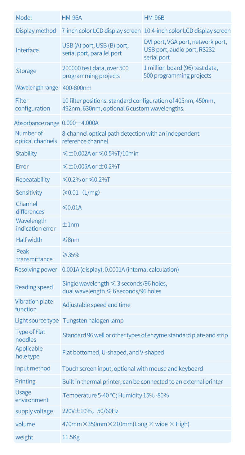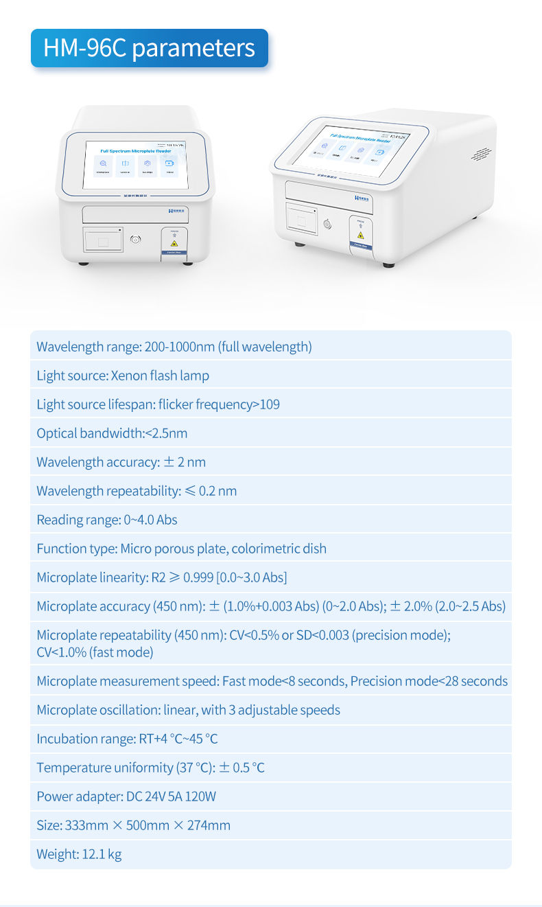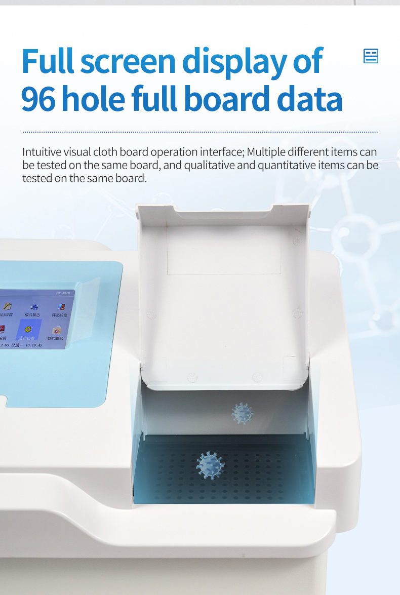 4. Measurement modes: single wavelength detection, dual wavelength detection, two-point method, kinetic method, enzyme inhibition rate, endpoint method, rate method.