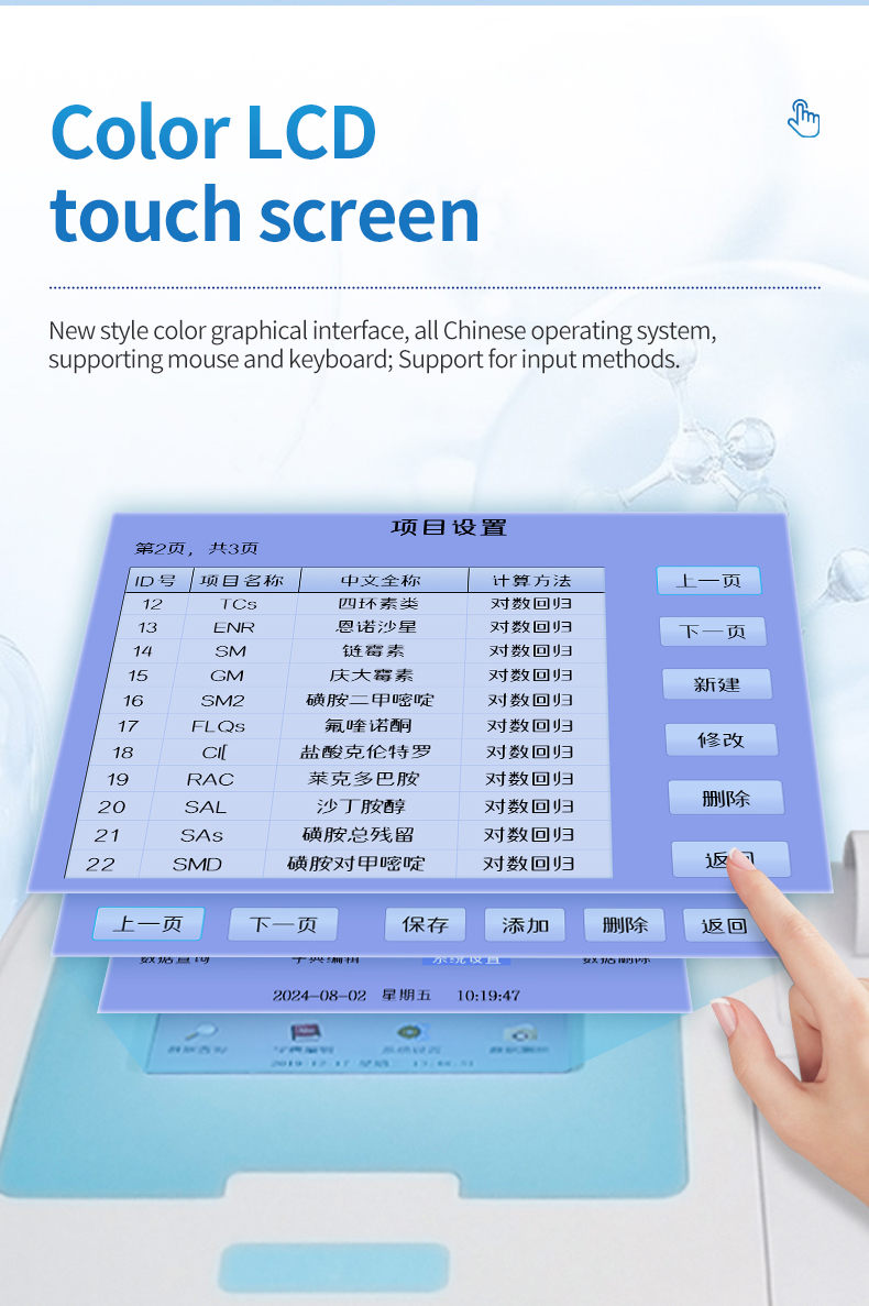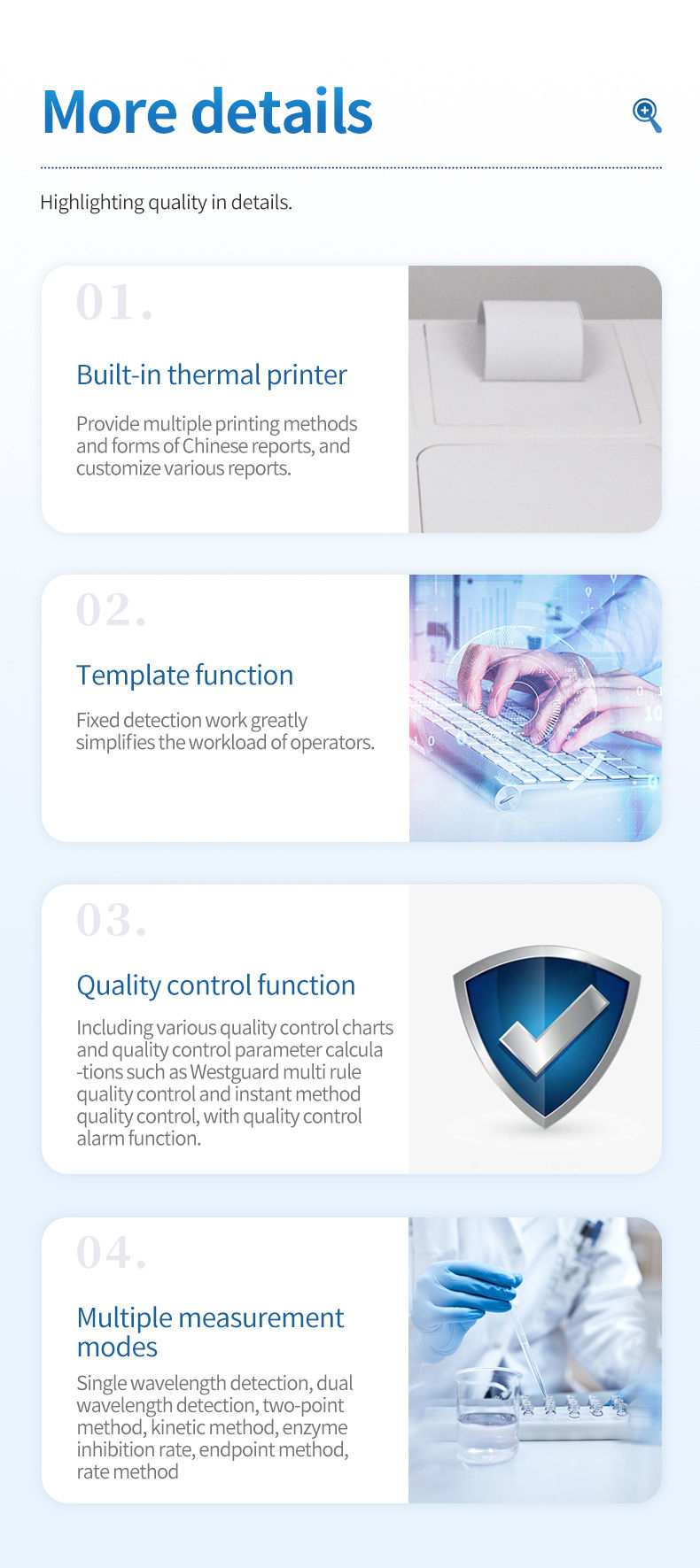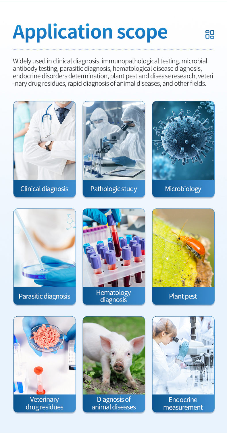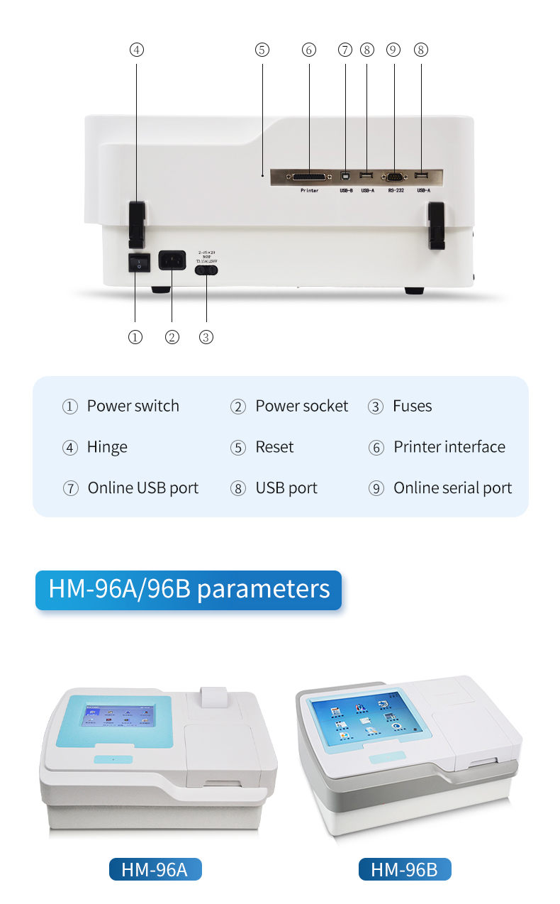 4. Measurement modes: single wavelength detection, dual wavelength detection, two-point method, kinetic method, enzyme inhibition rate, endpoint method, rate method.
