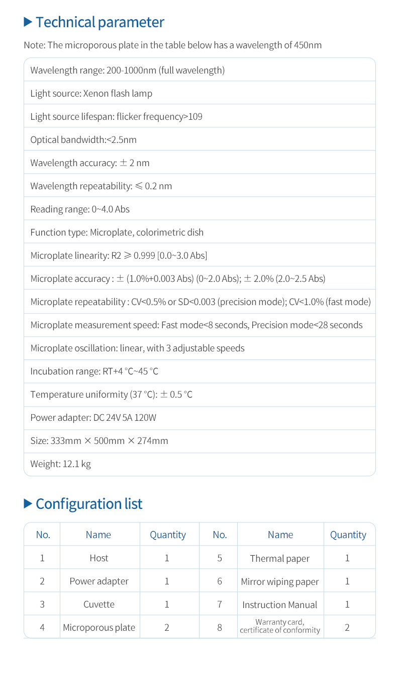 12. Microplate measurement speed: Fast mode<8 seconds, Precision mode<28 seconds