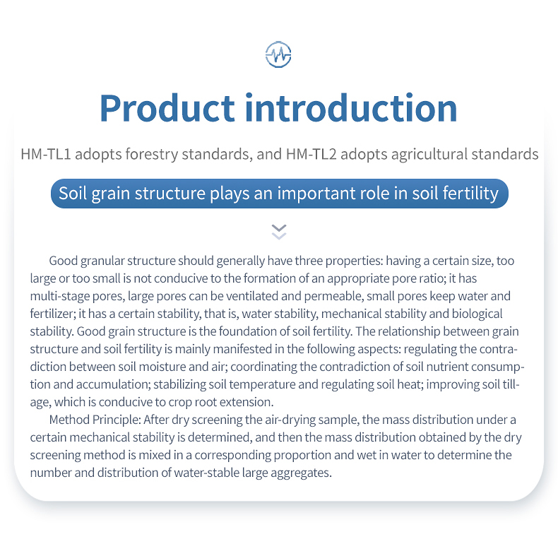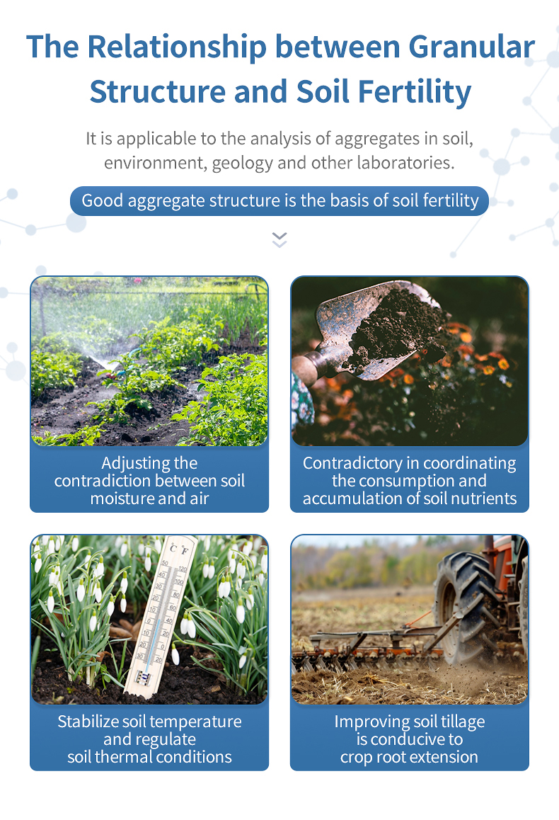 1. Soil aggregate structure plays a crucial role in soil fertility. A good aggregate structure generally possesses three properties: a certain size (too large or too small is detrimental to forming an appropriate porosity); multi-level porosity (large pores allow for air and water permeability, while small pores retain water and fertilizer); and a certain degree of stability, namely water stability, mechanical stability, and biological stability. Good aggregate structure is the foundation of soil fertility. The relationship between aggregate structure and soil fertility is mainly reflected in the following aspects: regulating the imbalance between soil moisture and air; coordinating the imbalance between soil nutrient consumption and accumulation; stabilizing soil temperature and regulating soil thermal conditions; and improving soil tilth, which is beneficial for crop root extension. The soil aggregate analyzer is suitable for the analysis of aggregates in soil, environmental, and geological laboratories.