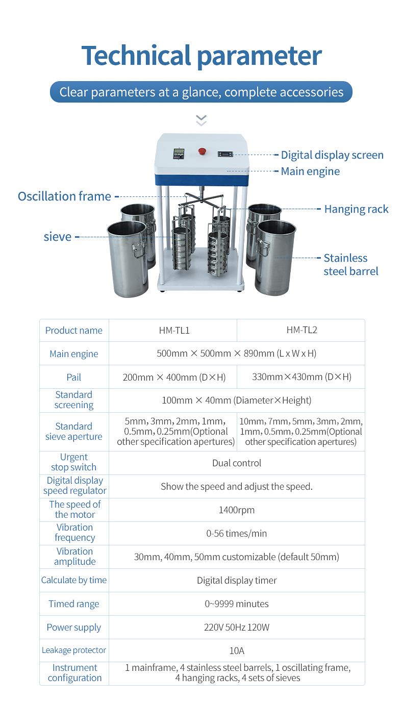 4. Standard Sieve Aperture: 5mm, 3mm, 2mm, 1mm, 0.5mm, 0.25mm. (Other aperture sizes are optional)