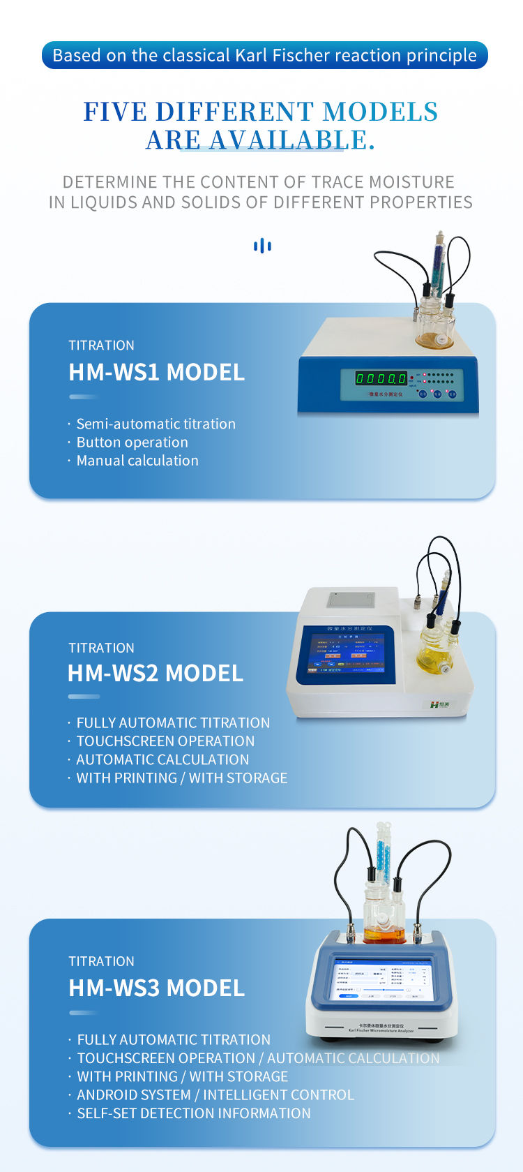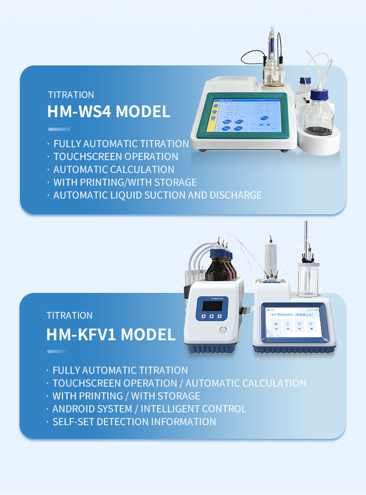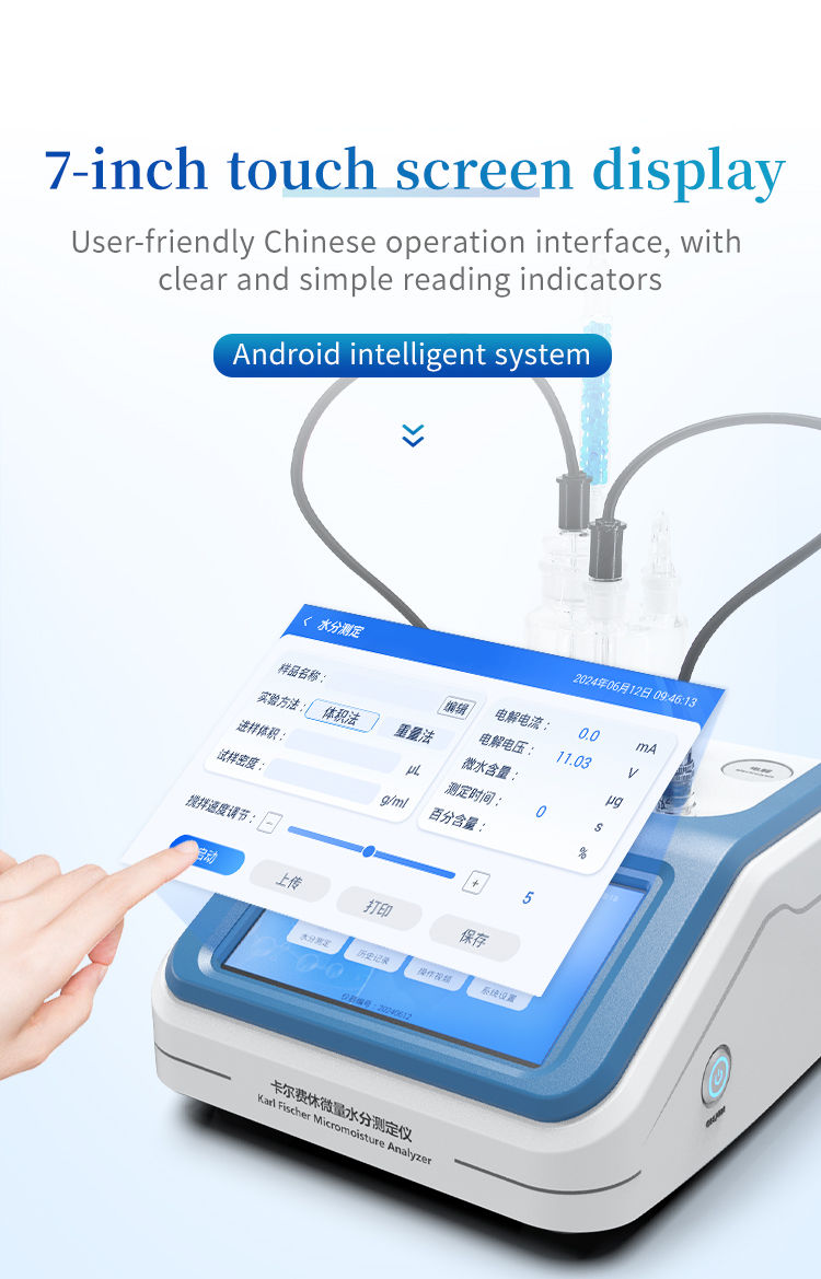 Karl Fischer titration (volumetric titration method) is a precision analytical instrument based on the classical Karl Fischer reaction principle, specifically designed for accurately determining the moisture content in samples. The volumetric method calculates the water content directly by the volume consumed by the titrant, with efficient operation and accurate and reliable results.