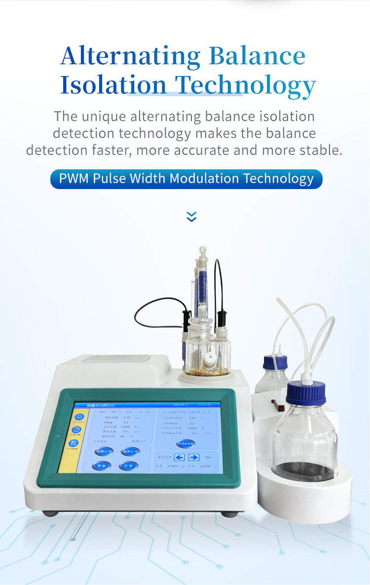 The Karl Fischer method is based on the quantitative reaction of I ₂, SO ₂, and water. The instrument uses the permanent stop titration method to indicate the endpoint, and the electrode monitors the sudden change in current during the titration process to accurately determine the reaction endpoint, thereby calculating the sample moisture content based on the consumed Karl Fischer test dose.