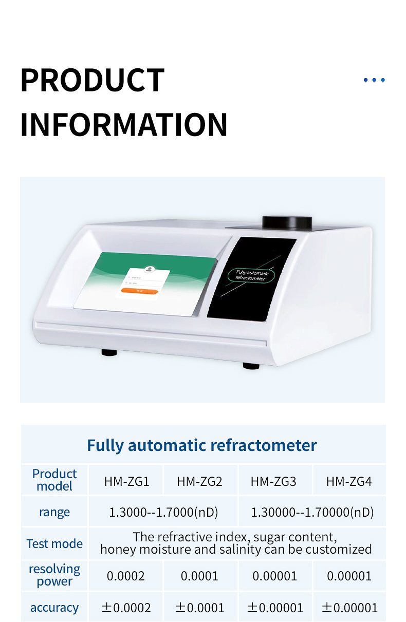 The HM series fully automatic refractometer is equipped with high-performance linear CCD photosensitive components, and is equipped with a semiconductor Peltier super temperature control system through high-speed and high-precision signal acquisition and analysis processing technology. It can efficiently and accurately measure the refractive index (nD) of various liquids such as transparent, semi transparent, dark, and viscous, as well as the mass fraction (Brix) of sugar solutions.