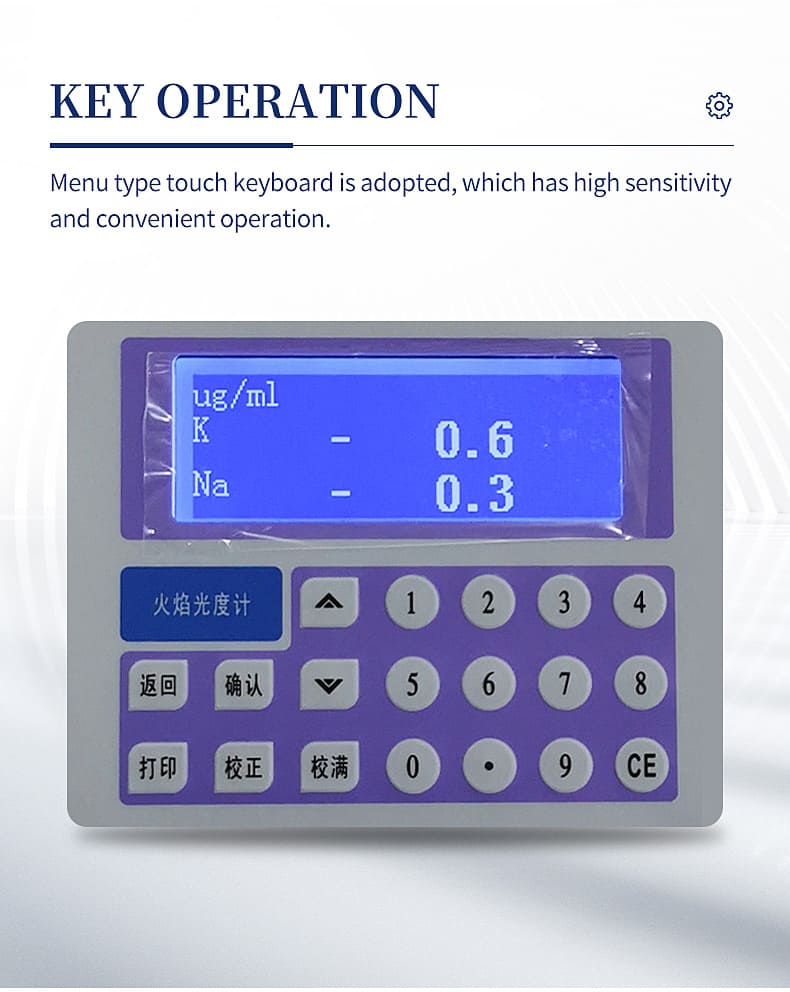 1) With the concentration direct reading function of K, Na, Li, Ca, and Ba elements, it can simultaneously display three arbitrary combinations of elements;