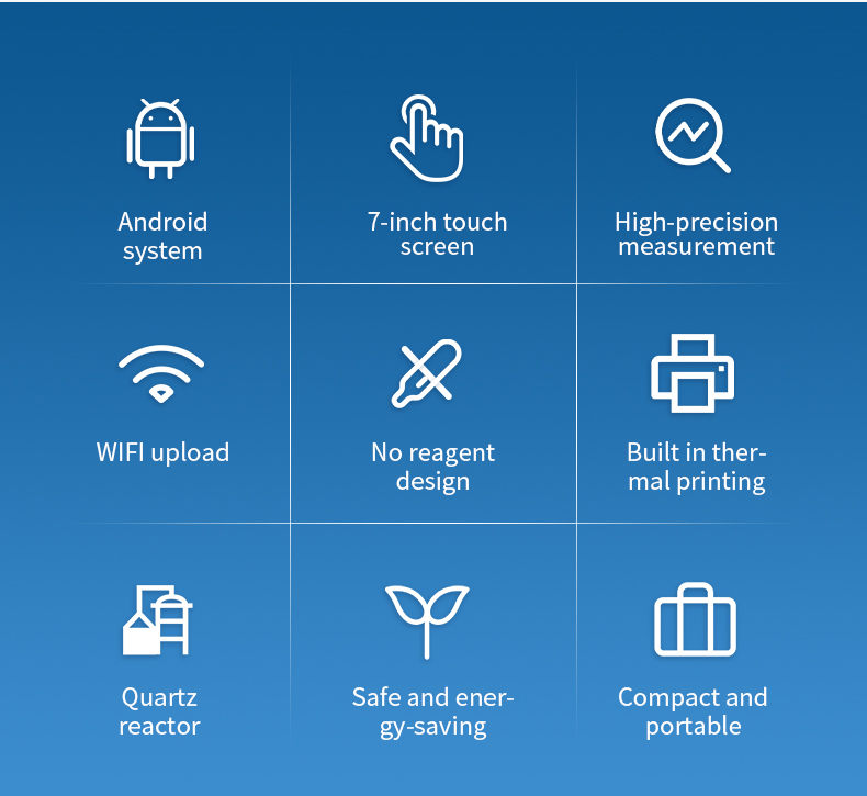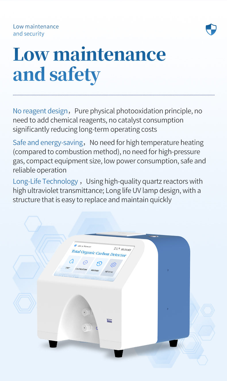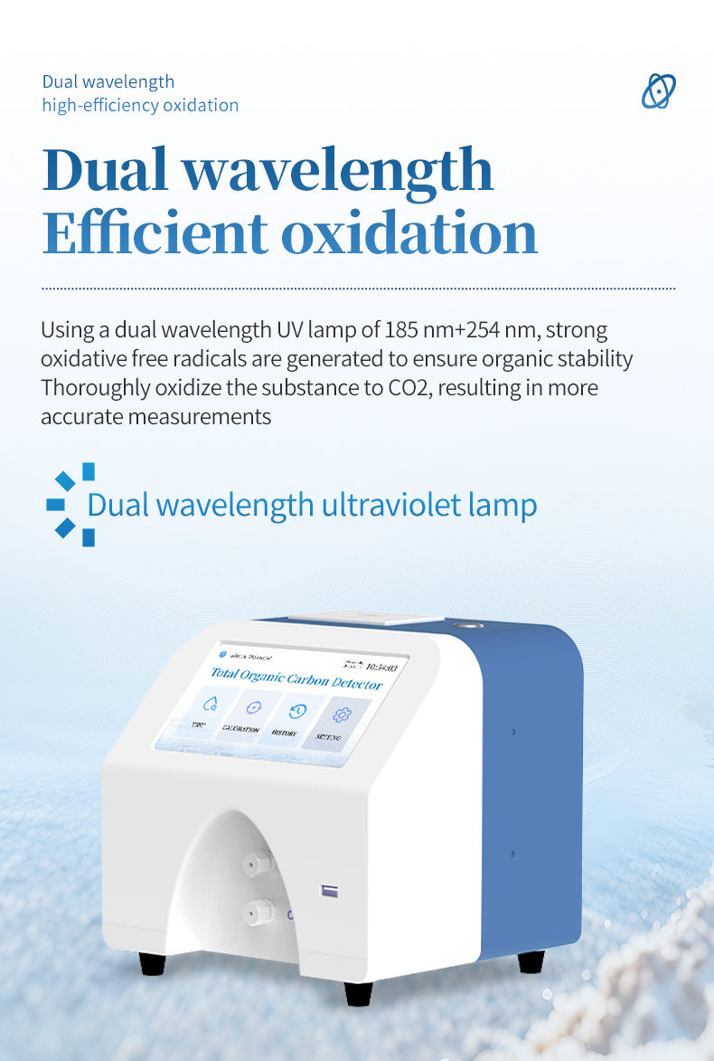 ★ (1) Dual wavelength high-efficiency oxidation: Using a 185 nm+254 nm dual wavelength ultraviolet lamp, strong oxidative free radicals are generated to ensure complete oxidation of organic matter to CO ₂, resulting in more accurate measurement.