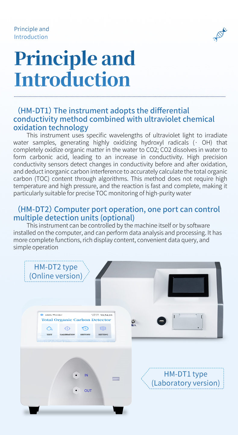 The product has the characteristics of low detection limit, high sensitivity, fast response speed, and good stability. The operating interface is simple and easy to use. It can be widely used for the detection of production water, injection water, and purified water in industries such as pharmaceuticals, microelectronics, and power. It is a reliable tool to ensure water quality safety and meet the requirements of pharmacopoeia and relevant industry regulations.