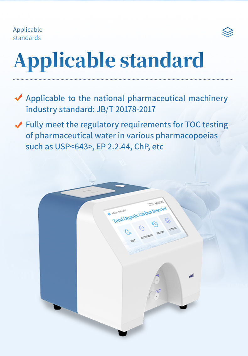 (3) Compliance guarantee: Fully meet the regulatory requirements for TOC testing of pharmaceutical water in various pharmacopoeias such as USP<643>, EP 2.2.44, ChP, etc.
