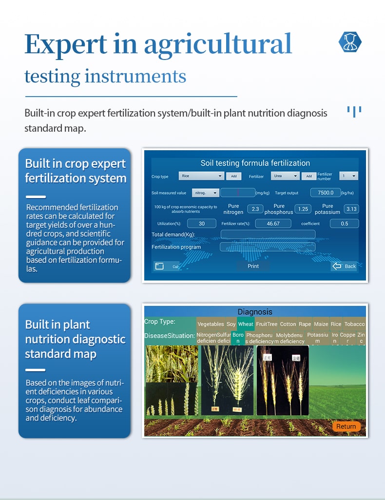 ★9. Built-in crop expert fertilization system, which can calculate the recommended fertilization amount for the target yield of more than 100 kinds of national agricultural economic crops, fruit trees, etc., and scientifically guide agricultural production based on the fertilization formula. The results of soil testing and fertilization formula can be printed, and the printed content includes: crop type, fertilizer type, target yield, total demand, and recommended fertilization plan.