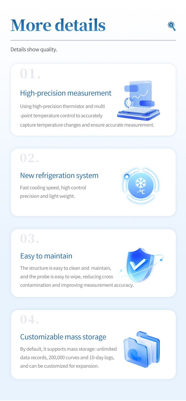 2. High-precision measurement: Utilizes advanced thermistor technology to accurately capture minute temperature changes. High-precision sample probes and multi-position temperature monitoring precisely control ultracooling, freezing processes, and sample measurement, resulting in accurate measurement results.