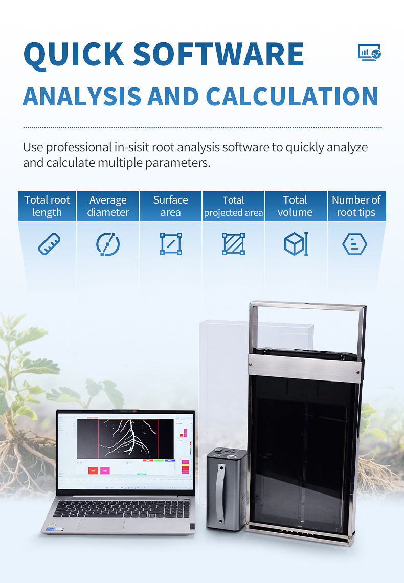 Professional in situ root analysis software can be used to quickly analyze and calculate root morphology parameters such as total root length, average diameter, surface area, total projected area, total volume, and number of root tips.